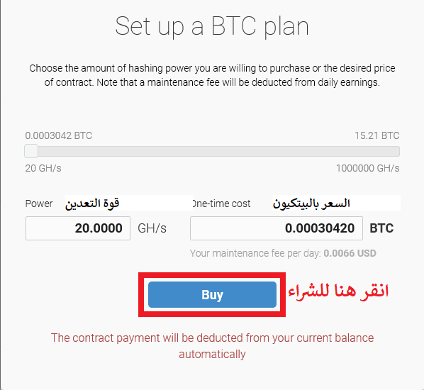 تنبثق لك نافذة لتحدد كم سوف تستثمر بالبيتكيون و ما هي قدرة التعدين التي سوف تحصل عليها في المقابل , اقل شئ يمكن شرائه هو 20 جيجا هاش 20 GH/s ما يعادل 2 دولار