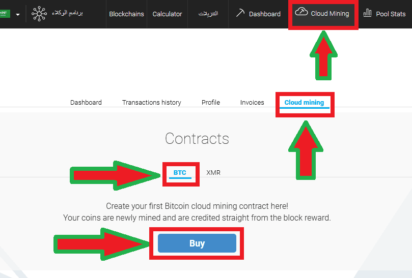 بعد الدخول تتجه مباشرة الى قسم cloud mining من الاعلى ثم تختار عملة BTC و هي البيتكيون لا تعدن المونيرو لانها مكلفة و غير مربحة , بعدها تنقر على زر Buy للشراء .